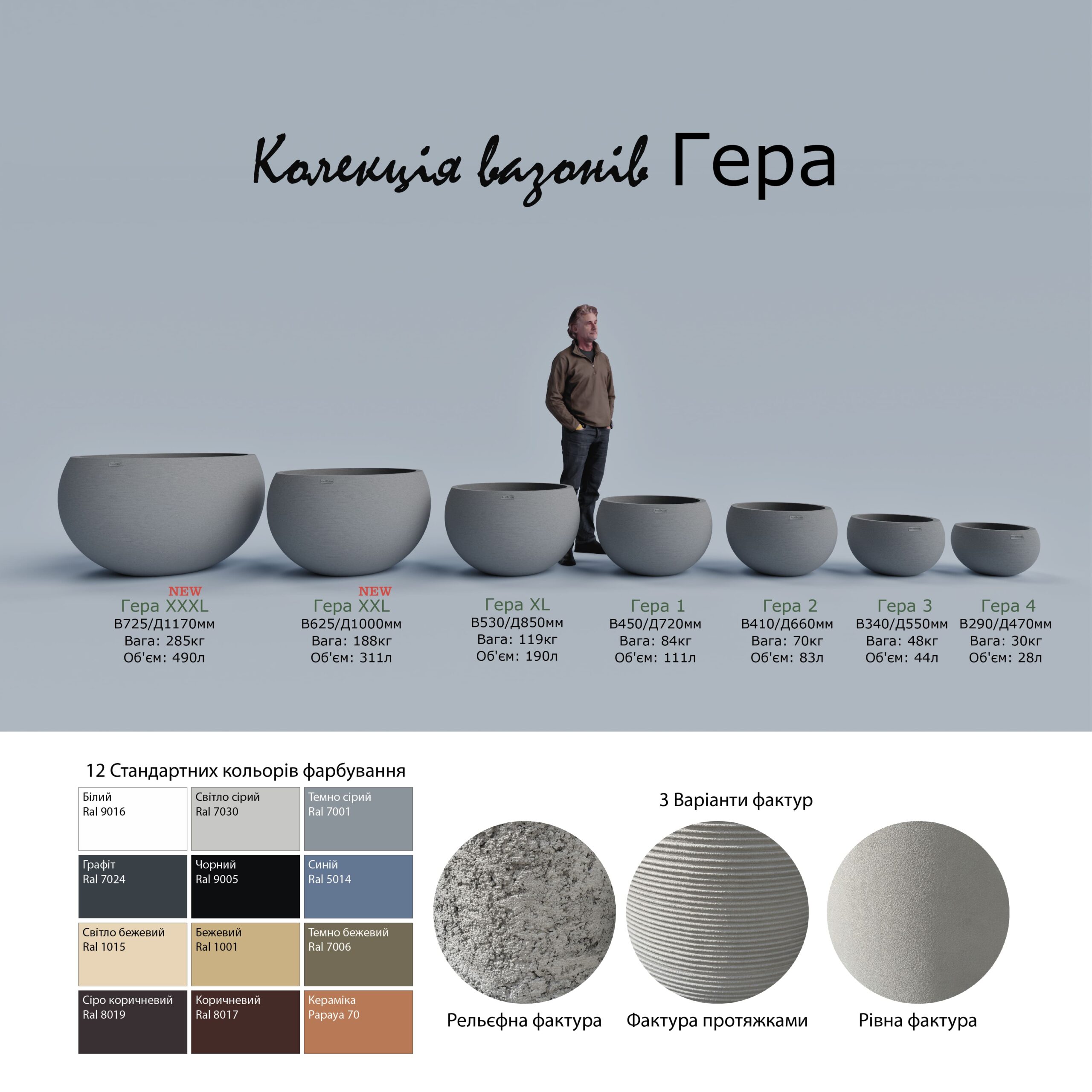 Серія бетонних вазонів Гера, нараховує 7 різних розмірів.