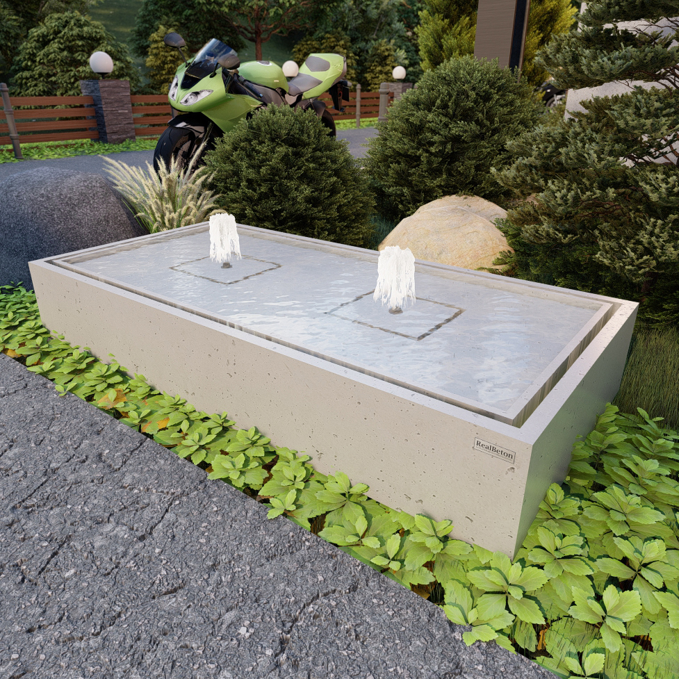 Бетонний фонтан Прямокутник — Додайте елегантності та заспокійливого звуку води вашому саду або терасі за допомогою нашого сучасного бетонного фонтана. Завдяки лаконічному дизайну та двом потужним гейзерам, цей фонтан стане центральним елементом будь-якого ландшафту, від мінімалістичного хай-теку до затишного лофта.