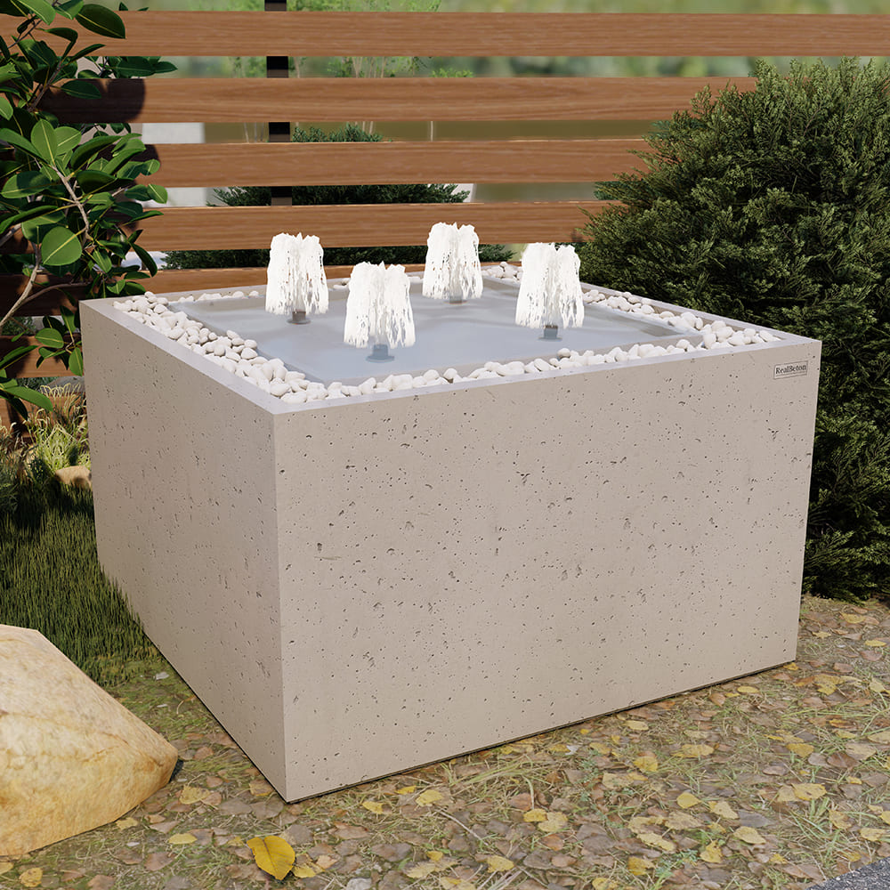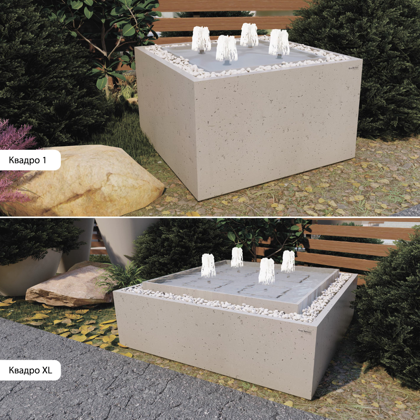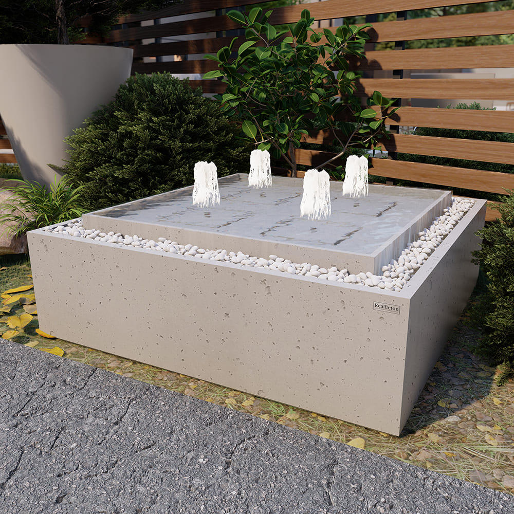 Бетонний фонтан Квадро — це втілення сучасного мінімалізму та функціональності. Завдяки чотирьом соплам, він створює багату водну картину, яка дарує відчуття спокою та свіжості. Це ідеальне рішення як для приватного саду чи тераси, так і для громадських зон чи інтер’єрів.