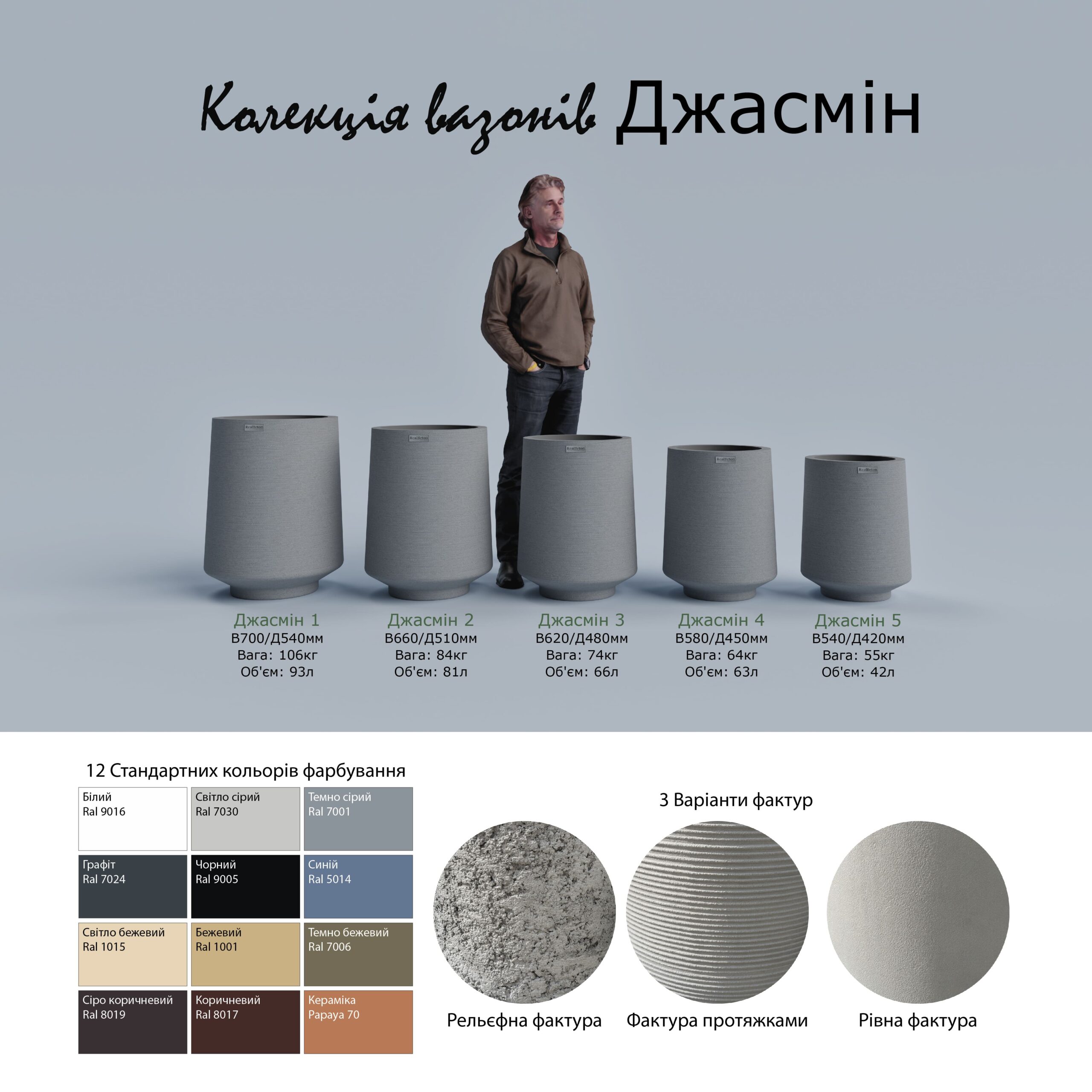 Серия бетонных вазонов Джасмин, насчитывает 5 разных размеров.