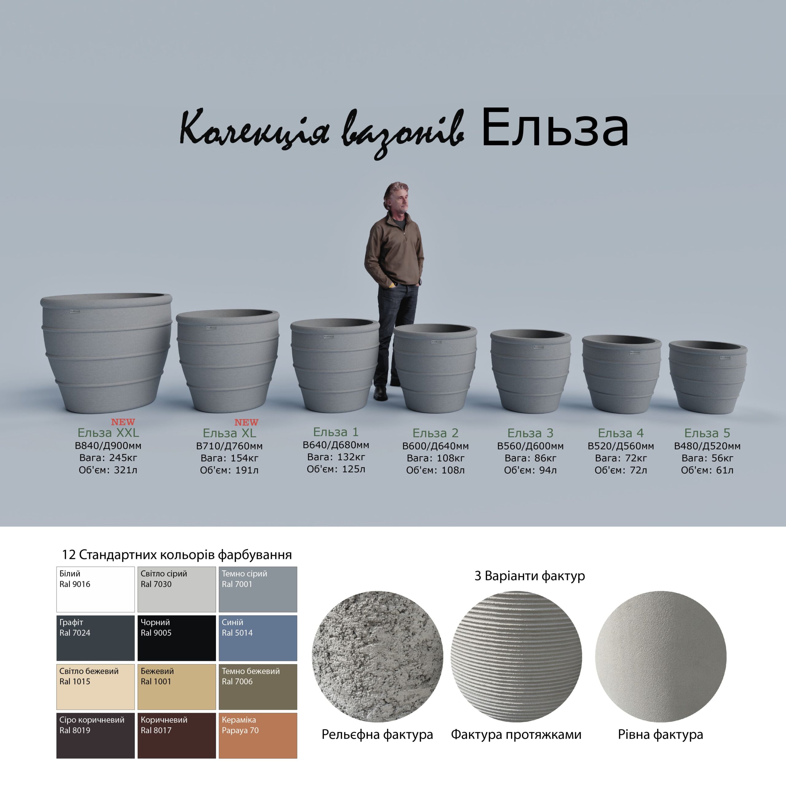 Вазон бетонный – ЭльзаСерия бетонных вазонов Эльза, насчитывающая 7 разных размеров.Каждый из которых может быть исполнен в одной из трех фактур.На Ваш выбор: Рельефная, Протяжная и Ровная фактура.Также есть возможность заказать дополнительные опции для каждого изделия:Гидроизоляция или покраска в нужный цвет.Все вазоны выполнены из армированного бетона. Подробную информацию Вы можете получить у нашего менеджера.