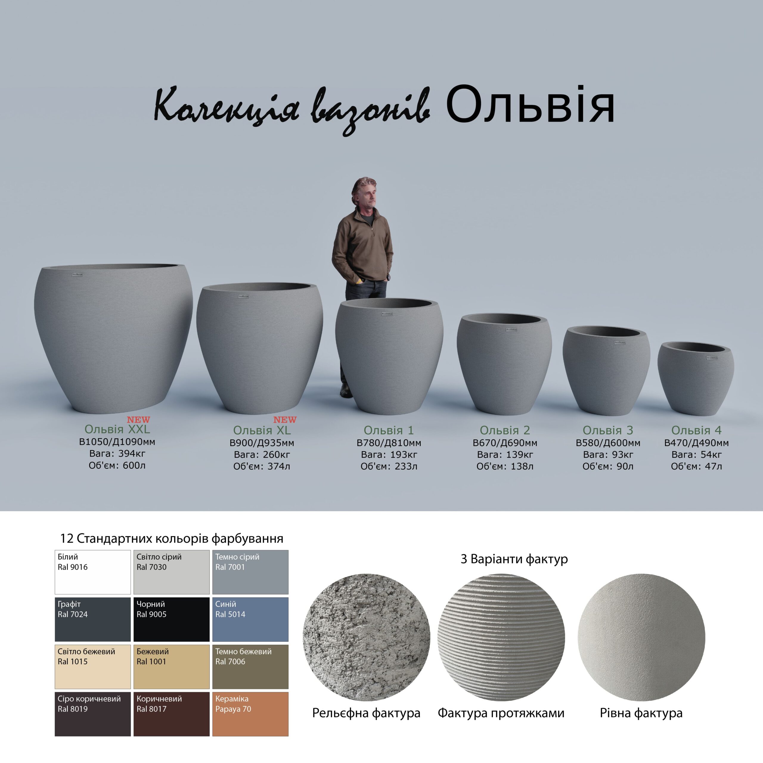 Серия бетонных вазонов Ольвия насчитывает 6 разных размеров.